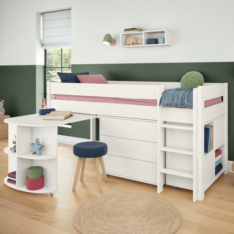 Painted wooden frameHigh foot endSlatted baseSpace savingAssembled on deliveryCan only be delivered to mainland UKThis midsleeper lifts the sleeping area, creating a snug retreat while maximising floor space for essential activities below. The pull-out des