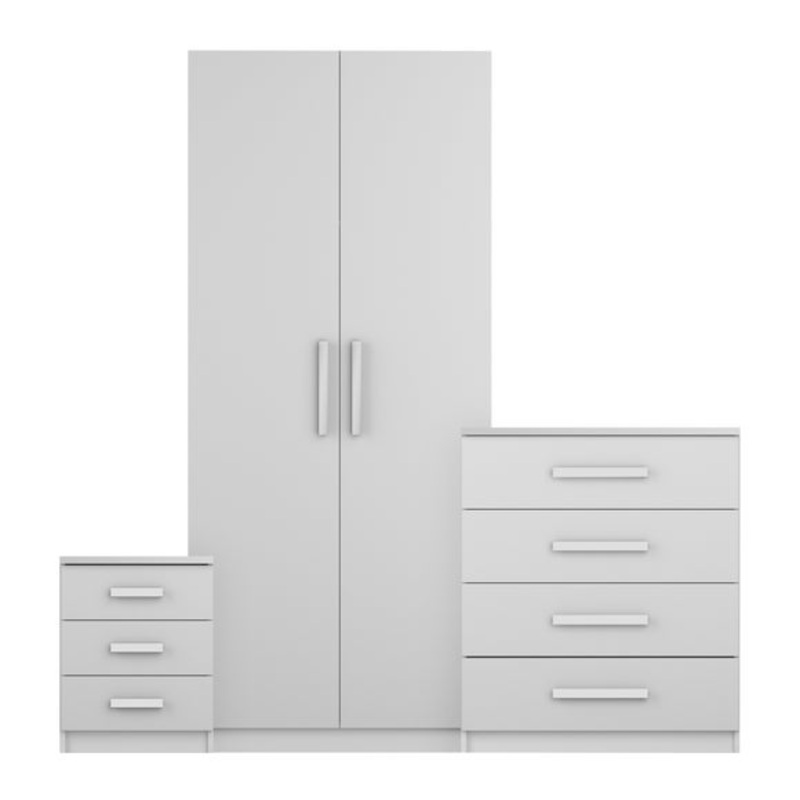 This Sudbury 3 Piece Double Wardrobe Bedroom Furniture Set introduces an extra-height wardrobe with a vertical build system, internal shelves, and reliable metal door hinges. The set includes 1 bedside table, 1 chest of drawers, and a wardrobe with stylish grey or white gloss fronts.