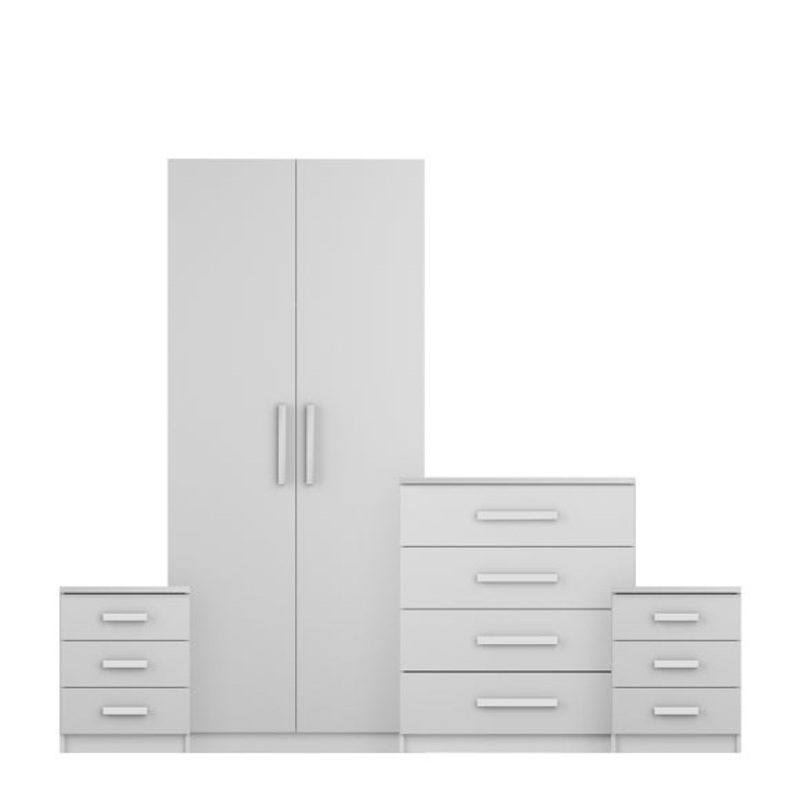 Set includes: 2 x Bedside Table, 1 x Chest of drawers, 1 x WardrobeSilver effect handlesSet offers ample storage spaceVertical Build SystemThis Sudbury 4 Piece Double Wardrobe Bedroom Furniture Set offers an extra-height wardrobe with a vertical build syst