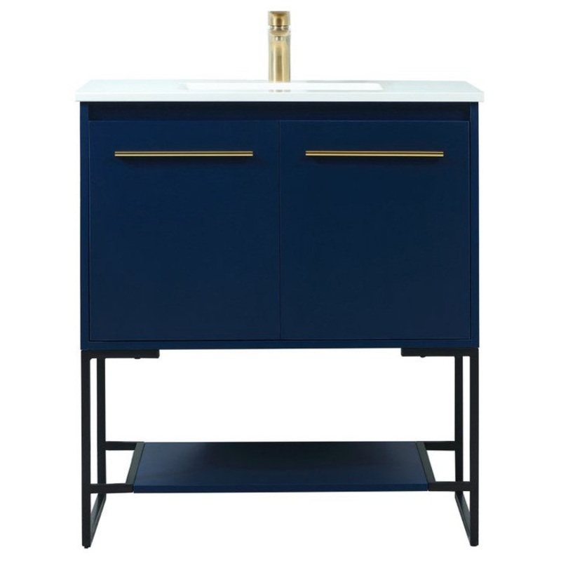 Live in modern comfort with this 30" blue finish vanity. Dressed in a blue and sleek gold metal hardware, its contemporary style will have your bathroom or powder room elevated in industrial sophistication. The open shelf at the base and two doors reveal a