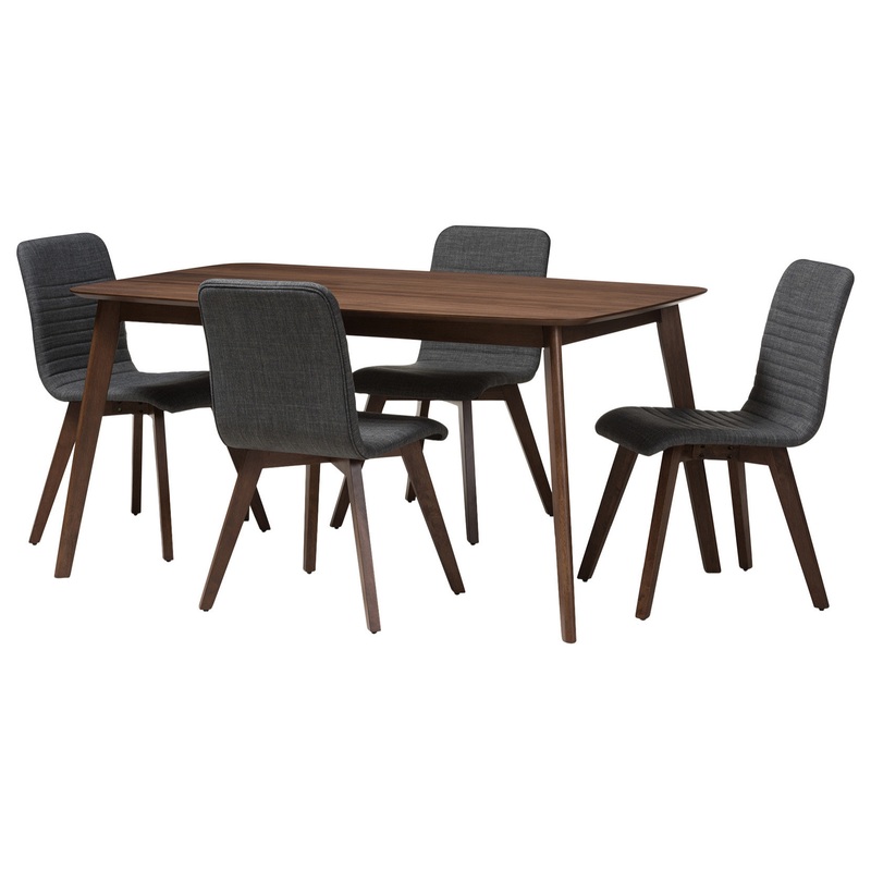 Slightly contoured for comfort and luxury in its modern color, the Sugar five-piece dining set is the perfect addition to your home. The Sugar chairs are upholstered in dark grey fabric, perfect for everyday seating around the dining table or mixing and matching with other colors for a pop of modernity. The table of the Sugar dining set has a rounded edge design, encouraging a casual, mid-century modern inspired vibe. The table and chair legs feature a warm, walnut-finish, with shapely angled legs. The versatile dining set can easily add a retro flair to your dining room, breakfast nook, or rec room. Malaysia, the Sugar requires assembly.