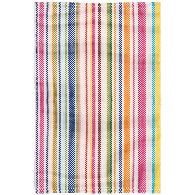 Vertical chambray stripes of Navy, Sprout, Lemon, Tangerine, Fuchsia, Pink, French Blue, and Turquoise weave their way down a simple white ground in this playful and reversible flatweave rug. Like the rest of our polypropylene indoor/outdoor rugs, it’s washable, scrubbable, and bleachable, making it perfect for high-traffic areas such as family rooms, playrooms, or any room that needs playful pops of juicy, delicious color.