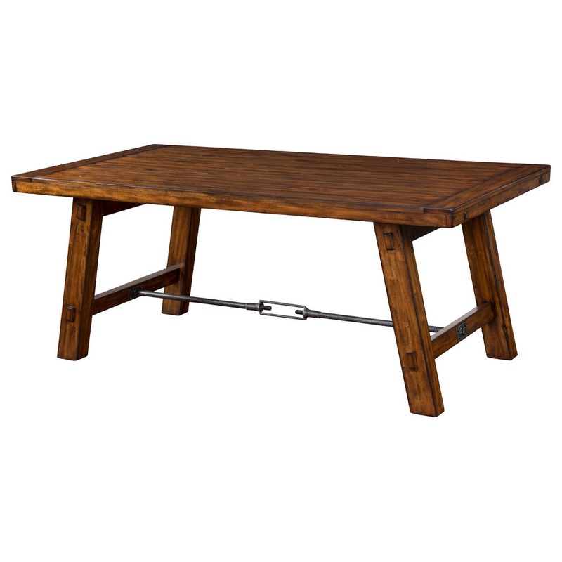This solid mahogany Tuscany collection dining table is a classic statement of craftsmanship and features rustic turnbuckle hardware. Features: -Materials: Wood -Finish: Vintage mocha - medium brown -Turnbuckle stretcher -Planked top -Wood type: Mahogany Sp