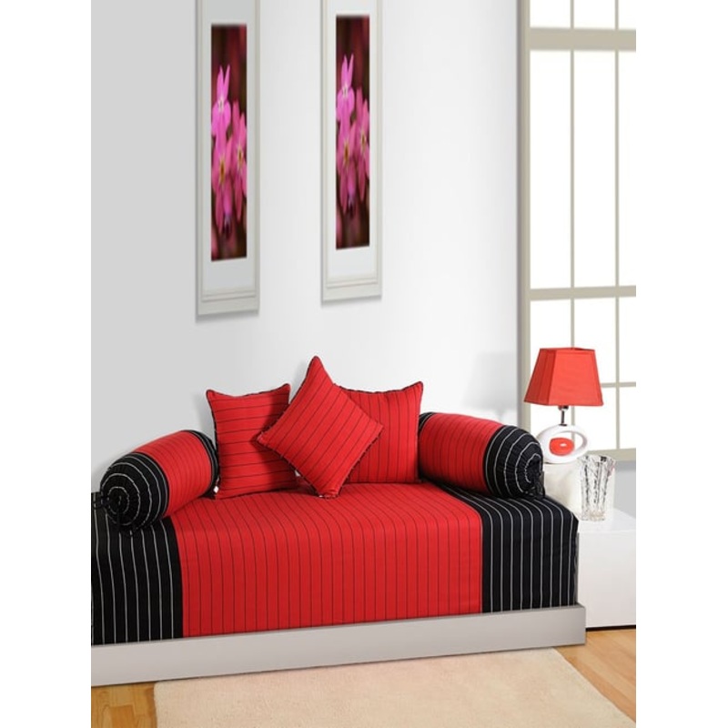Elevate your living room decor with this red and black 6 pieces diwan set from the Magical Linea collection by Swayam. The set with a striped pattern breaks the surface monotony to create a simple, yet pleasing and aesthetic effect. This set comprises 1 diwan sheet, 2 bolster covers and 3 cushion covers that are tailored from cotton.