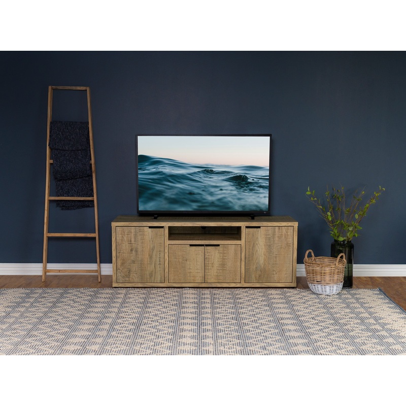 Center your entertainment set-up in this charming farmhouse TV stand. Featuring melamine paper in a mango finish, the console offers ample storage and plenty of charm. Layered coloring mimics the depth of true wood grain, while roughhewn saw marks add a sense of authenticity and dimensionality. Four cabinets open to reveal hidden storage, perfect for keeping media and gaming essentials tucked away. A center shelf is just right for a gaming console or media components, allowing for air circulation and line of sight for remote controls.