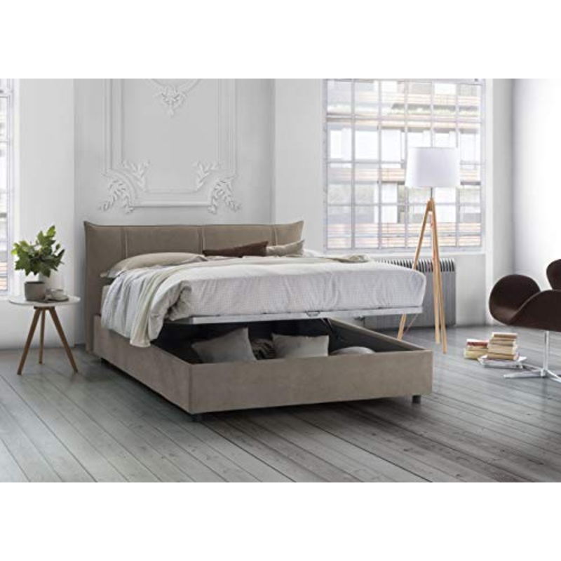 Dettagli: LETTO ALICE MATRIMONIALE - Letto matrimoniale dal design moderno Alice con testata e contenitore rivestiti in tessuto imbottito di colore Tortora, con materasso in memory incluso da 160x200 cm. STRUTTURA - La struttura del letto in fibra di legno
