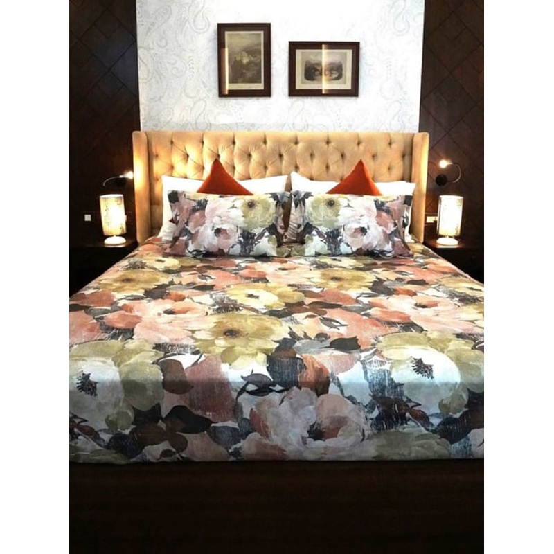 This charming and vibrant set of 1 king-sized bedsheet and 2 pillow covers from TARA Sparkling Homes creates an impression of a lush Florence garden vista. Fresh shades of raspberry, fern, cyan blue and purple haze accentuate the watercolor techniques in this beautifully crafted bed linen. Enjoy every nuance and fragrance of blossoming Fiore beautifully splashed over the brush-stroked textural ground in mocha brown or dove grey. Digitally printed on premium 350 thread count pure cotton fabric, it offers spectacular touch and drape.