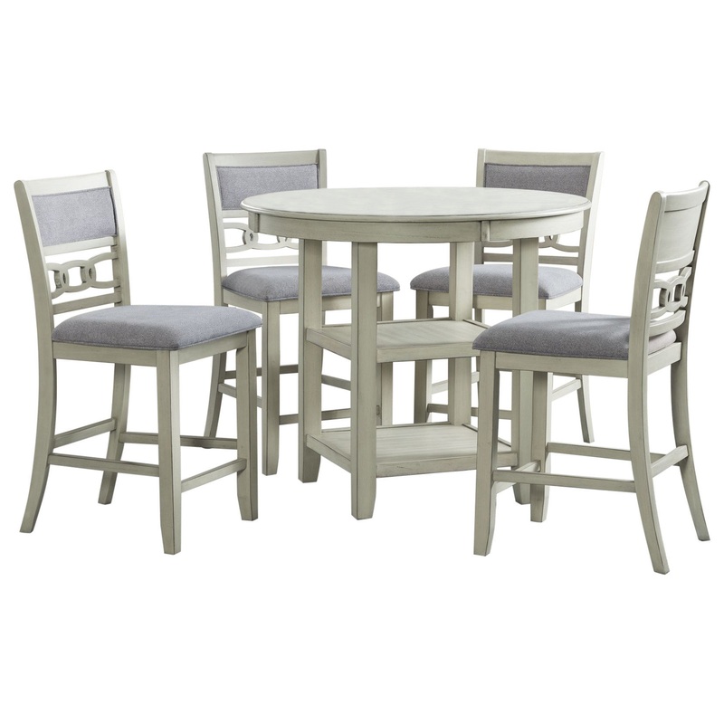 The Picket House Furnishings Taylor Counter 5PC Dining Set will look fantastic in your home! This set includes a table and four side chairs. This set is ideal for small space living allowing you to easily move around the round table top. The table also comes with a shelf in the base, while the kicked-out legs instantly add extra flair to this already stylish set. The chair backs and seats are upholstered in a gray fabric, that pairs beautifully with the bisque finish. Another cool design feature, the chairs have a link design in the back taking this set to the next level. Add this dining set to your home today for a look you’ll enjoy day after day!