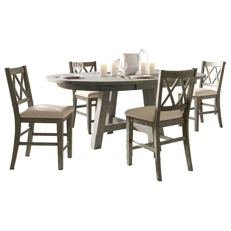 Absolutely stunning distressed rustic Pine with a contemporary driftwood finish, the Telluride collection is spectacular handcrafted furniture perfect for any room in your home. This set includes four matching upholstered barstools and one counter height table. With the 24-inch extension leaf that comes with this farmhouse dining table, you can easily switch from a round shape, which saves space, to an oval shape that accommodates more guests, making it perfect for hosting large families or entertaining. Crafted for both comfort and functionality, this dining table helps to create a living space that reflects your individuality and unique style