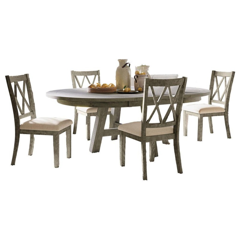 Absolutely stunning distressed rustic Pine with a contemporary driftwood finish, the Telluride collection is spectacular handcrafted furniture perfect for any room in your home. This set includes four matching upholstered dining chairs and one table. With the 24-inch extension leaf that comes with this farmhouse dining table, you can easily switch from a round shape, which saves space, to an oval shape that accommodates more guests, making it perfect for hosting large families or entertaining. Crafted for both comfort and functionality, this dining table helps to create a living space that reflects your individuality and unique style