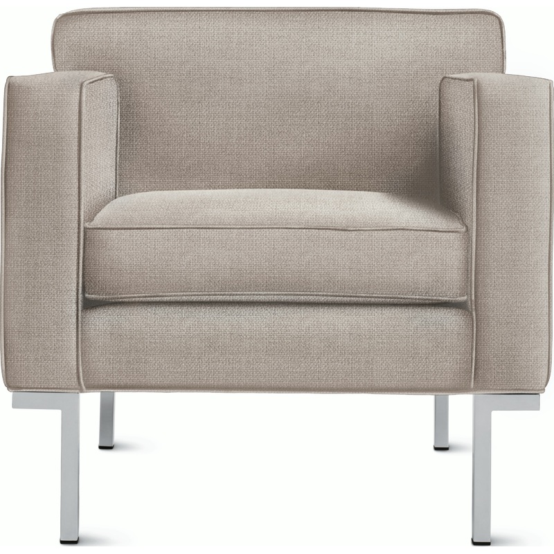 Designed to accommodate the human body with studied proportions and simple geometry, the Theatre Collections (2001) comfort stems from its form rather than excessive layers of stuffing. With a gently angled backrest, full seat depth, and elevated armrests, the Theatre Armchair displays Boerners signature artisanal details. A gleaming chromed steel base runs the entire depth of the design, and welted seams lend strength and definition to the upholstery.