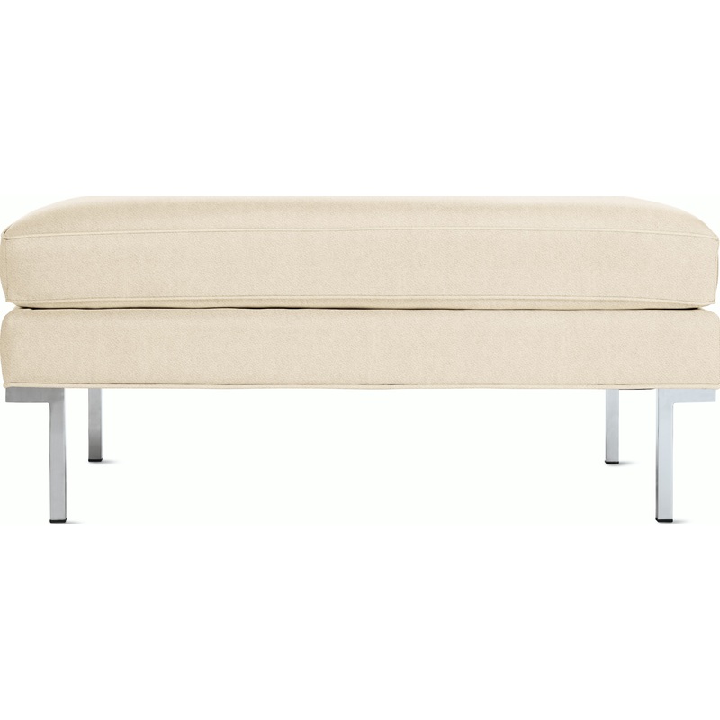 Designed to accommodate the human body with studied proportions and simple geometry, the Theatre Collections (2001) comfort stems from its form rather than excessive layers of stuffing. Serving as a comfortable spot to kick up your feet or rest a book, the Theatre Ottoman stands on a gleaming chromed steel base runs the entire depth of the design. Welted seams lend strength and definition to the upholstery.