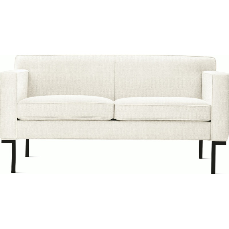 Designed to accommodate the human body with studied proportions and simple geometry, the Theatre Sofas (2001) comfort stems from its form rather than excessive layers of stuffing. With a gently angled backrest, full seat depth, and elevated armrests, the Theatre Sofa displays Boerners signature artisanal details. A gleaming chromed steel base runs the entire depth of the design, and welted seams lend strength and definition to the upholstery.