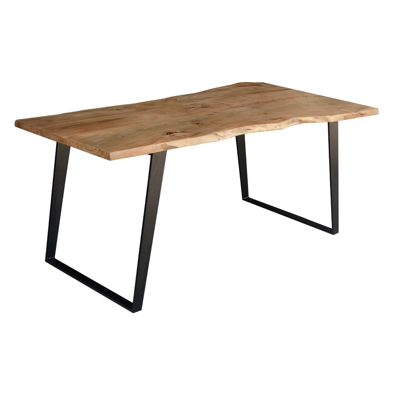This rectangle dining table, made of solid slab of acacia wood and complemented by modern stainless steel legs, has a versatile design. The table is full of organic one-of-a-kind markings, giving each dining table a ton of personality. Every natural knot, crack and distinction is carefully preserved and praised. Looks great paired with our live edge dining bench. Rough-sawn planks are carefully hand-selected, planed and sanded.Tabletop bears the patina of reclaimed wood and is accented with distinctive nicks, exposed knots and imperfections that speak to the wood’s provenance. By their nature, salvaged wood planks may be somewhat uneven and may cup or bow slightly over time, further enhancing their rustic one-of-a-kind character; cracks will be present..