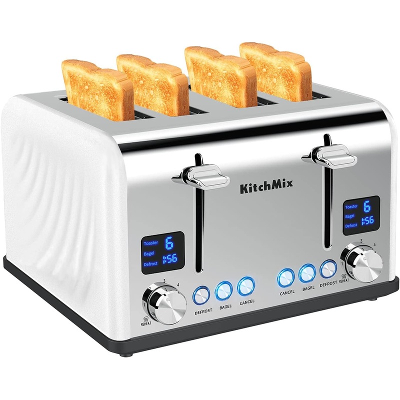 Toaster 4 Slice, KitchMix Bagel Stainless Toaster with LCD Timer, Extra Wide Slots, Dual Screen, Removal Crumb Tray (White)