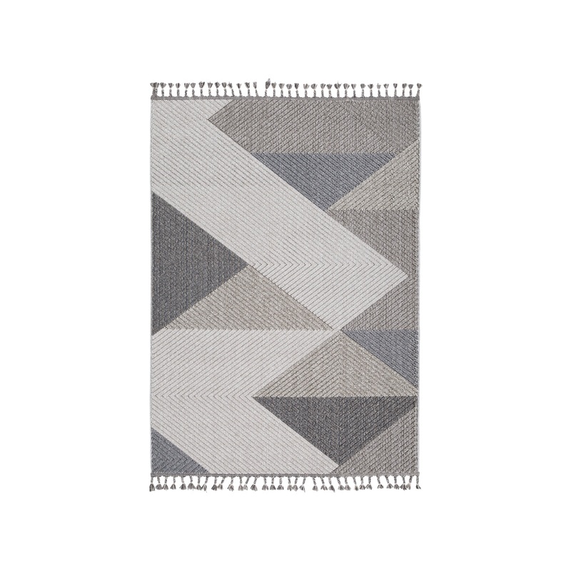 Update your space with the Toksook rugs eye-catching geometric design, featuring cream, gray, taupe, and a pop of muted blue. The braided tassel edge adds a handcrafted finish, giving this piece modern flair with a cozy twist.