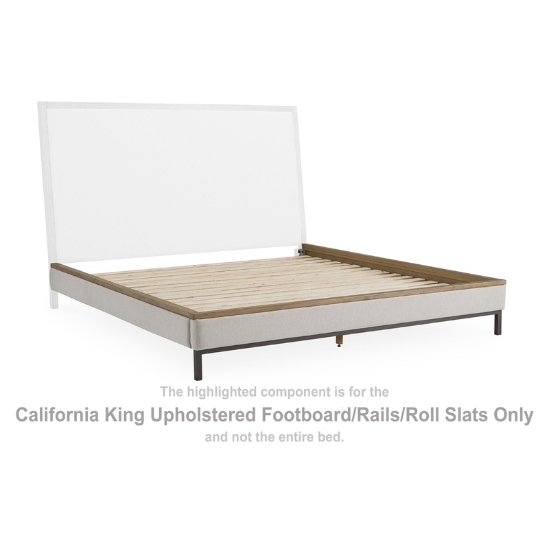This California king upholstered footboard, rails and roll slats set is made with engineered wood frames, solid wood blocking, foam and fabric. Pairs with other items in the series to make a bed kit.Additional DimensionsFootboard: 0"Assembled cal king upho