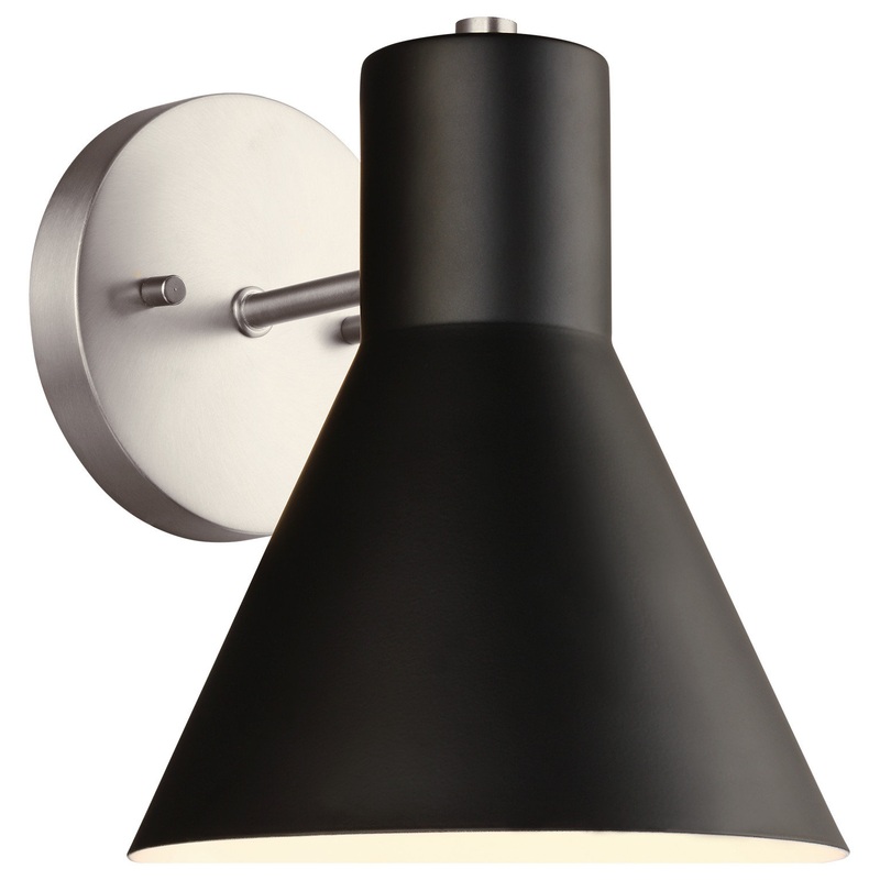 The Generation Lighting Lighting Towner one light wall sconce in brushed nickel provides abundant light for your bath vanity, while adding a layer of today’s style to your interior design. The Towner lighting collection by Generation Lighting Lighting brings mid-century, retro style to the traditional circular silhouette, creating a bold statement that would accent any space in your home. The conical light shades deliver a fun design statement along with the textured cloth cords, which are adjustable for leveling. These fixtures are ideal for dining room lighting, living room lighting and kitchen lighting. The assortment includes three-, five- and seven-light chandeliers, three- and five-light cluster pendants, eight-light island pendants, one-light mini pendants, and one-light wall sconces. The Towner Collection is available in two finishes, Satin Bronze and Brushed Nickel to complete the look. All fixtures are available as ENERGY STAR-qualified and California Title 24 compliant.