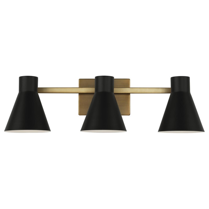 The Generation Lighting Lighting Towner three light vanity fixture in satin brass provides abundant light for your bath vanity, while adding a layer of today’s style to your interior design. The Towner lighting collection by Generation Lighting Lighting brings mid-century, retro style to the traditional circular silhouette, creating a bold statement that would accent any space in your home. The conical light shades deliver a fun design statement along with the textured cloth cords, which are adjustable for leveling. These fixtures are ideal for dining room lighting, living room lighting and kitchen lighting. The assortment includes three-, five- and seven-light chandeliers, three- and five-light cluster pendants, eight-light island pendants, one-light mini pendants, and one-light wall sconces. The Towner Collection is available in two finishes, Satin Bronze and Brushed Nickel to complete the look. All fixtures are available as ENERGY STAR-qualified and California Title 24 compliant.