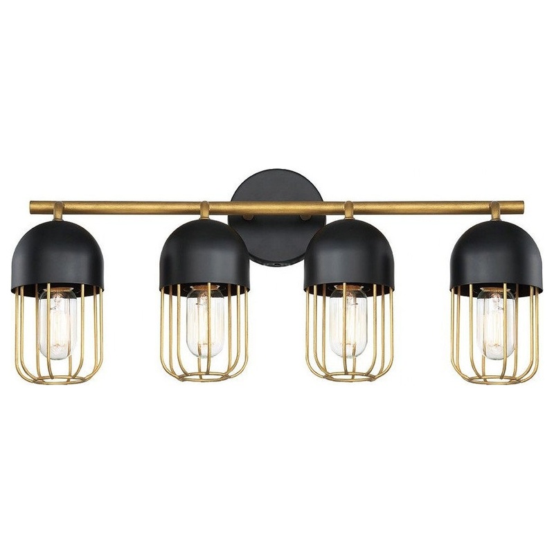 Traditional 4-Light Bathbar with Gold Metal 10.25 x 23.25 inches Vanity & Bath . Marine Highway 4-Light Bathbar Matte Black Finish with Rich matte black paired with a bright golden open cage. Product Type: BathbarFixture Style: TraditionalCanopy Backplate