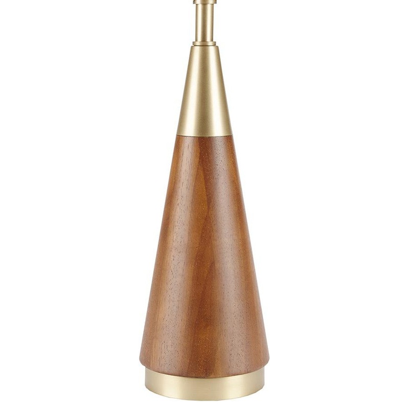 Simple architectural shapes in a pecan finish with gold accents will add style to your mid-century setting combined with the white linen shade.