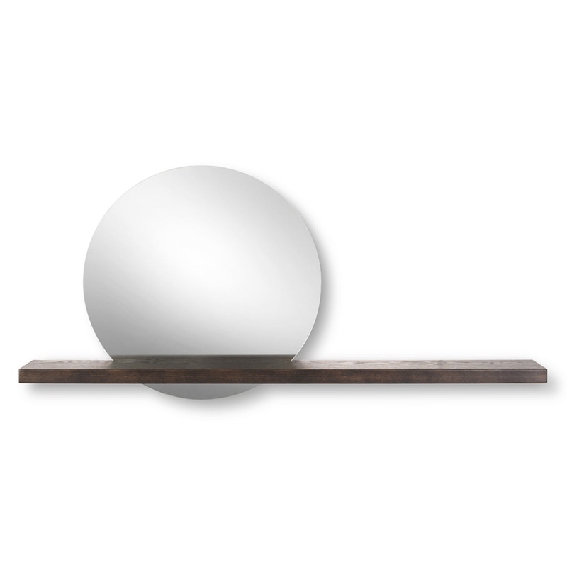 The piece has a round mirror and a long, solid red oak and metal shelf, creating a sculptural effect thatis truly eye-catching. Theshelf is availablewith an optional metal add-on shelf that attaches to the pieces main shelving unit.