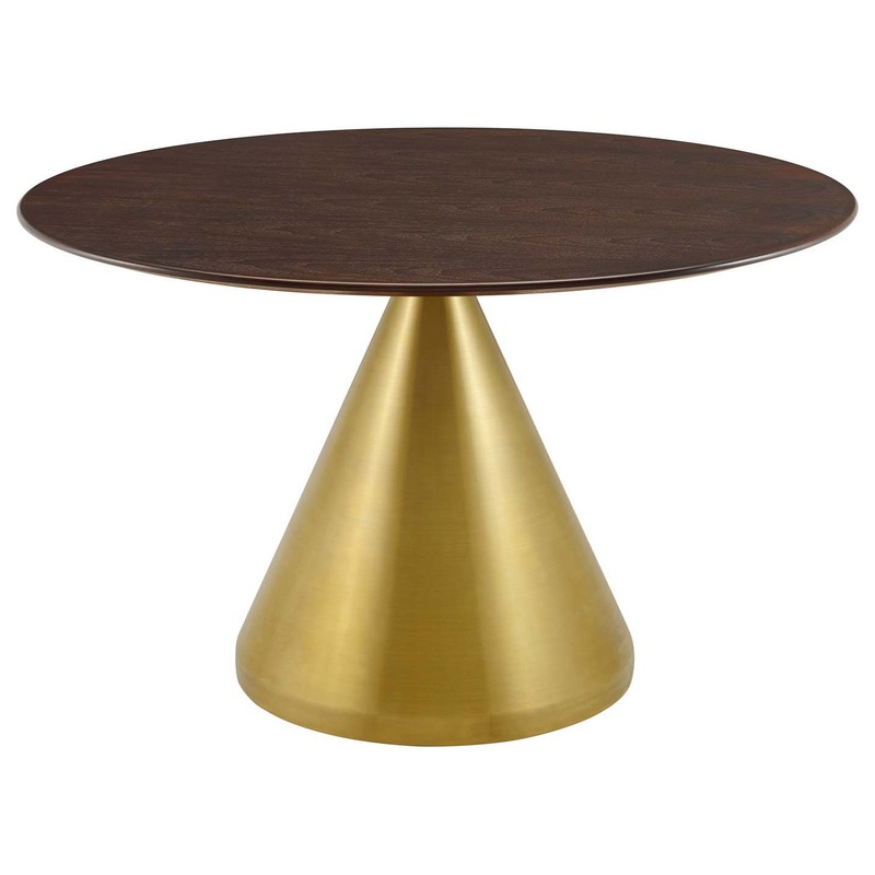 Connect with family and friends over good food and conversation with the Tupelo 47″ Dining Table. Inspired by modern style and mid-century influence, this pedestal table reflects an organic shape and is perfect for entertaining or everyday dining. This dining table rests on a conical polished gold metal pedestal base and features a 47″ tabletop crafted with MDF with an easy-to-clean wood grain veneer. Non-marking ring to protect flooring. Assembly required.