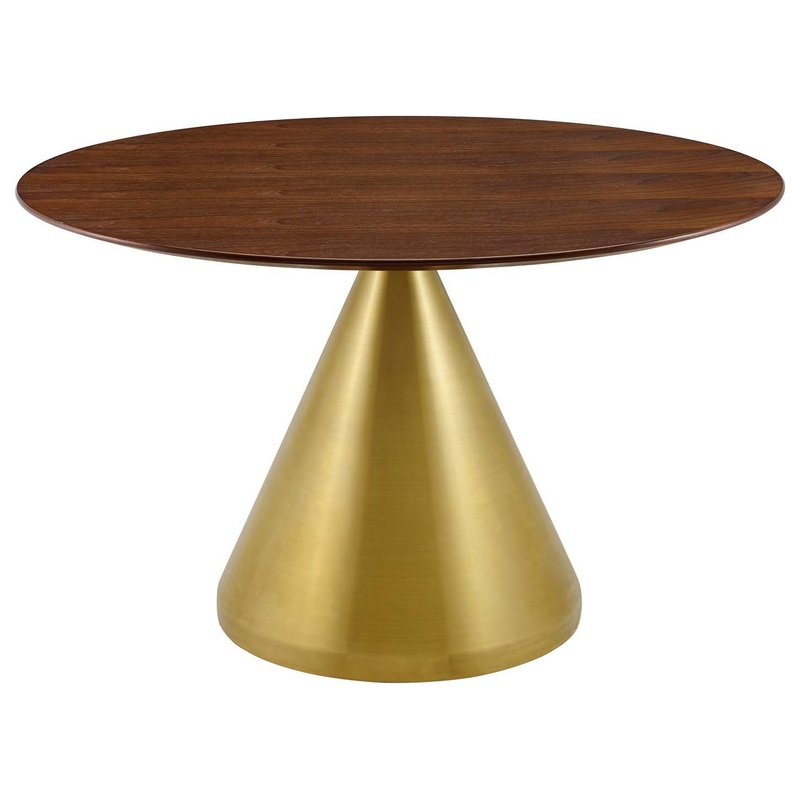 Connect with family and friends over good food and conversation with the Tupelo 47″ Dining Table. Inspired by modern style and mid-century influence, this pedestal table reflects an organic shape and is perfect for entertaining or everyday dining. This dining table rests on a conical polished gold metal pedestal base and features a 47″ tabletop crafted with MDF with an easy-to-clean wood grain veneer. Non-marking ring to protect flooring. Assembly required.