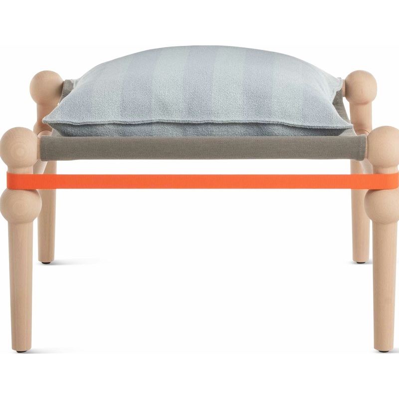 Add comfort and character to the Twain Low Chair with the Twain Footstool (2024) by German designer Konstantin Grcic. Its sturdy solid beech frame is made from interlocking spindles held in tension by a bright strap and ratchet. A self-supporting fabric seat is bolstered by a comfortable cushion in removable fabric. Made in Italy.