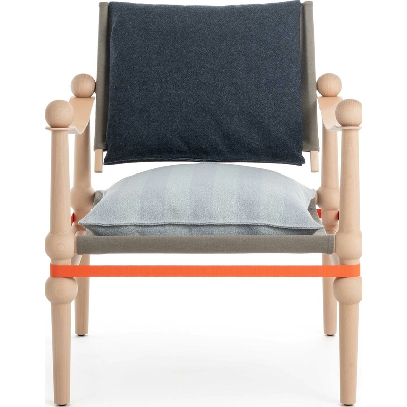 German designer Konstantin Grcic puts a decorative twist on a classic safari seat with the Twain Low Chair (2024). Its solid beech frame is made from interlocking spindles held in tension by a bright strap and ratchet. Two soft strips of leather are gracefully suspended as armrests. The seat and back are made from self-supporting fabric that tilts with the movement of the sitter to ensure maximum support. Two cushions in removable fabric provide added comfort. Grcic originally trained as a cabinet maker, and his expert eye is evident in this clever medley of wood, leather, and fabric. Made in Italy.