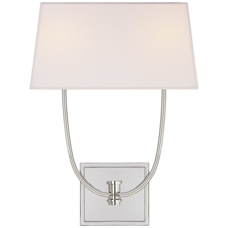 DimensionsWidth: 13.50"Height: 18.00"Extension: 5.50"Weight: 4.00 lbCanopy: 5.5" x 6" RectangleVenini Double Sconce in Polished Nickel with Linen ShadeLight InformationLight Bulbs and/or Light Source are not included.Unsure what bulbs to add to your order?
