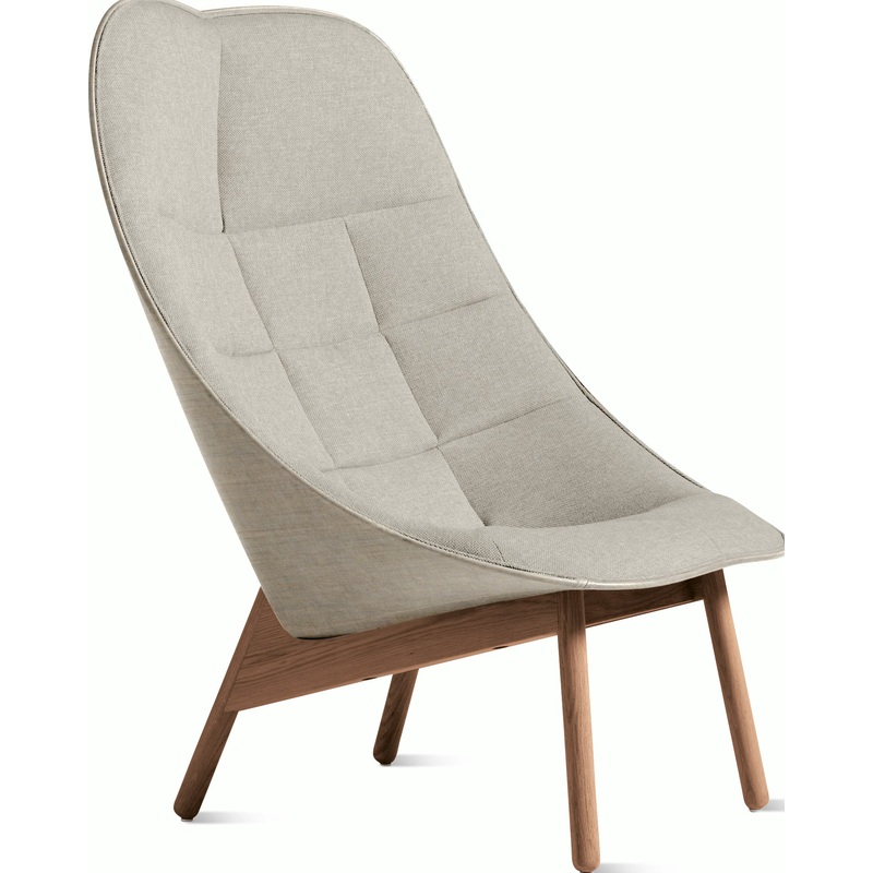 The Uchiwa Lounge Chair (2014) is a soft, open design, drawing inspiration for its profile from the traditional Japanese hand fan. Generous and inviting, its ideal for extended lounging. It's upholstered in a mix of fabric and full-grain leather for an int