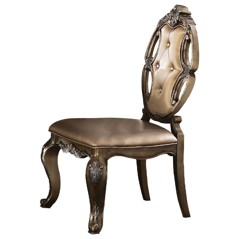-Dimensions: 22W x 26D x 43H in. -Seat height: 19 in. -Sturdy pine wood frame in gold finish -Gold faux leather upholstery -Intricate carving and tufting adds a glamorous look -Dining side chairProduct ID198051195Manufactured ByDecor LoveSold ByDecor LoveS
