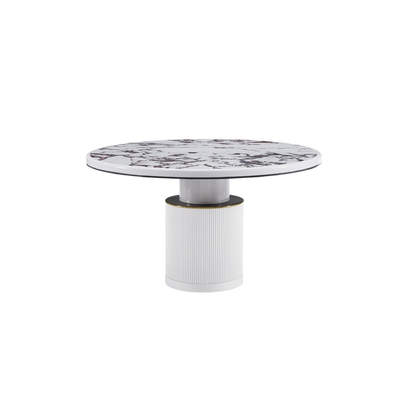 Simple and modern meets glam style with the Vanessa White Marble Lacquer Round Dining Table! Handcrafted to perfection, this table is the perfect certpiece in your dining space. The round, ribbed base features beautiful gold and black detailing topped with