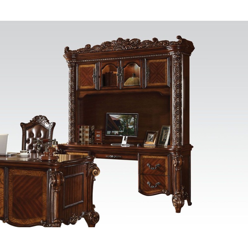 The Vendome collection classic style will blend masterfully in your home. The storage feature offers plenty of space to keep your office accessories, this set includes four top doors to reveal extra storage available. Carefully constructed from selected wood and veneers in rich Cherry Oak Finish. Highly decorative details, oversized crown, claw feet and decorative scrolled moldings on doors, gives this piece an elegant and sleek appeal.
