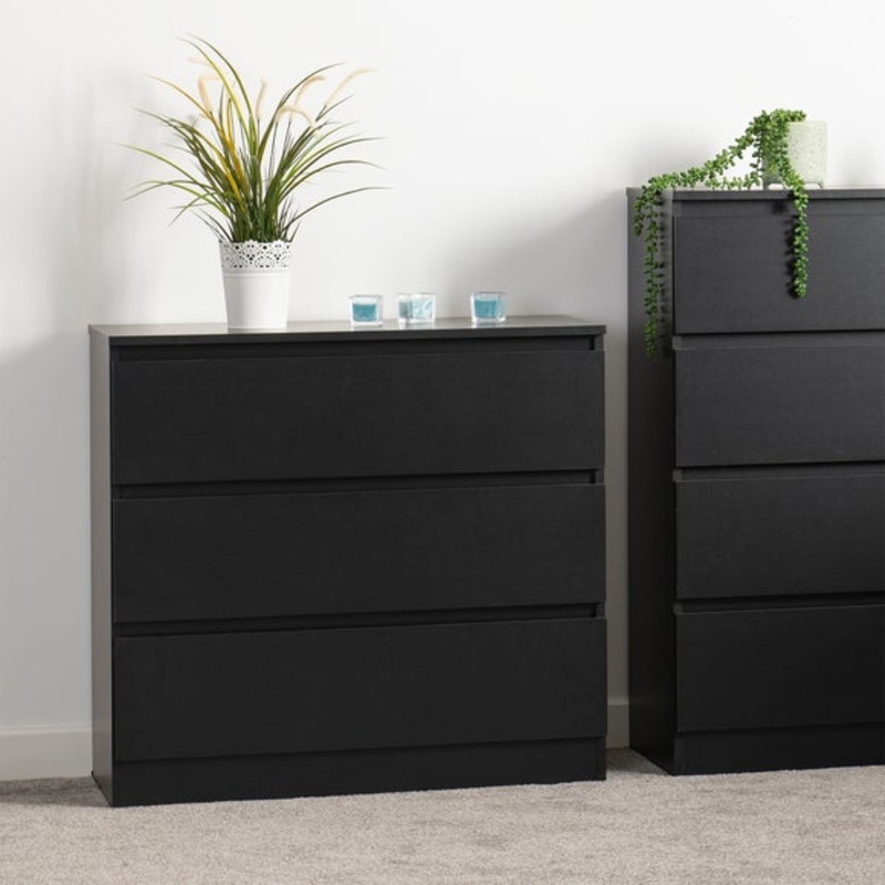 Available in a range of finishes to complement your decor, this chest of drawers blends contemporary style with essential storage capability. With three generously-sized drawers, it offers ample space to neatly organise clothing, accessories, and personal items. The robust construction ensures durability, while the sleek design and minimalist handles add a touch of modern elegance to any bedroom setting.