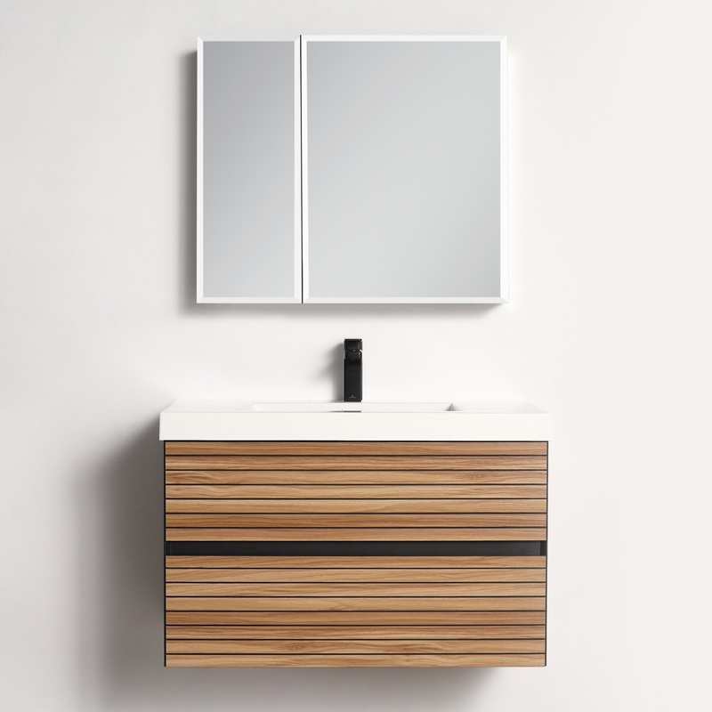 Contemporary Bathroom Style:The Handle-free miter-cut edge drawers opening design with natural wood color options in Maple Strip and Dark Walnut Strip, offering a simple yet modern and sleek minimalist look