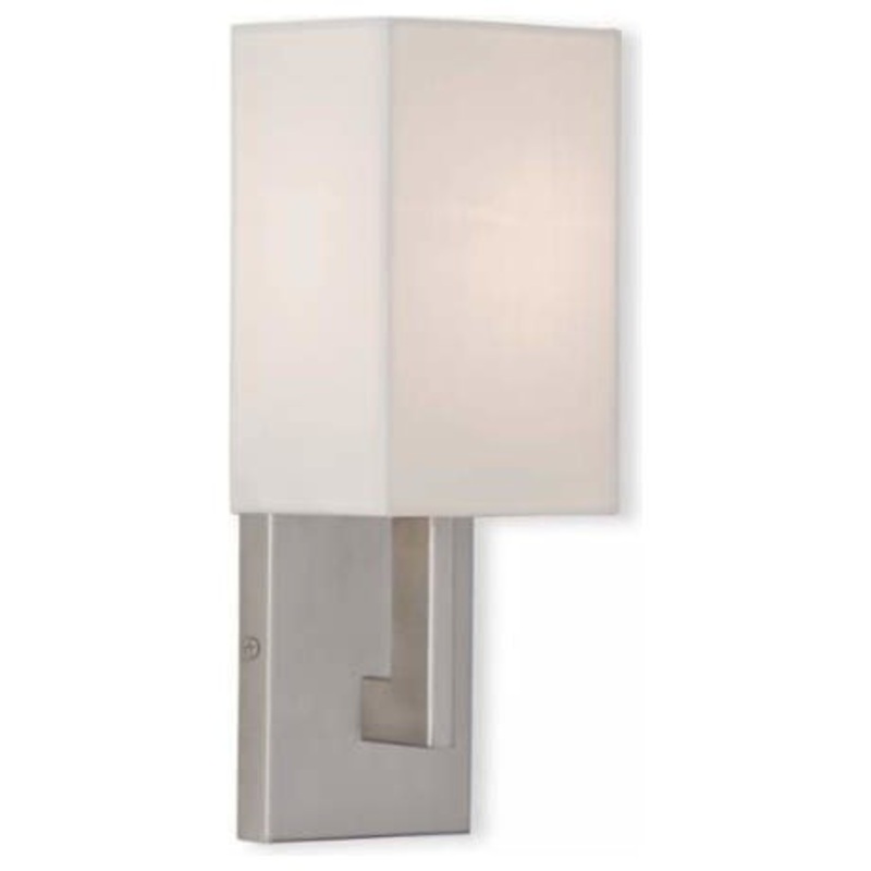 This wall sconce from the Hollborn collection has a clean, crisp look and contemporary appeal. The sleek back plate and angular arm feature a brushed nickel finish. The hand crafted off white fabric hardback shade offers warm light for your surroundings. -
