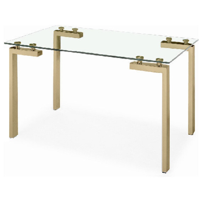 A strikingly simple, tempered glass top with gold metal legs. The metal legs adds sturdiness to the table and holds the heavy glass top. It's simple yet sophisticated design which helps your dining area to look much bigger. It's for residential as well as