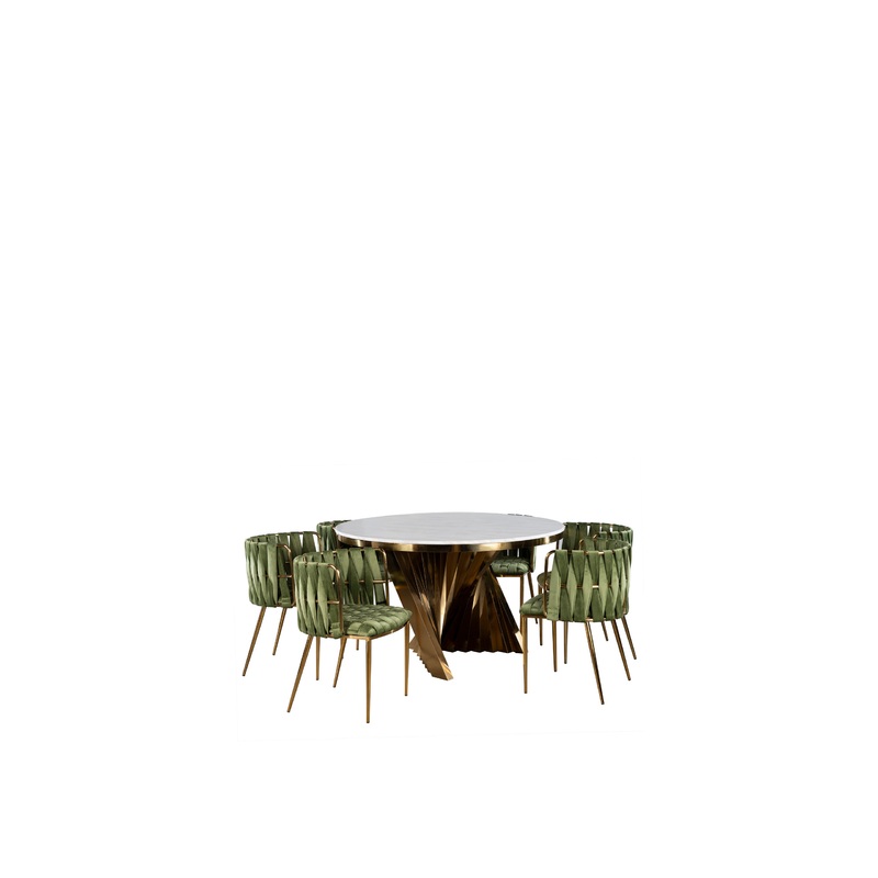 Sophisticated materials take a cue from modern geometry to create this spectacular dining table set. Gold color stainless steel forms uniquely curved angles to balance a contrasting polished white marble top. A refined spin on trend-forward design and comfort create this amazing dining set with 6 Milano Dining Chair.