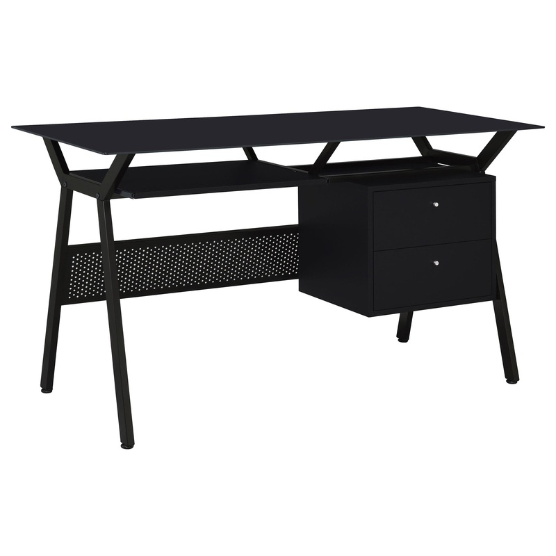 The sleek design of this computer desk adds a touch of taste and class to any workspace. Four supportive legs are elegantly curved to create an elegant silhouette. A black finish and black tempered glass top give it a pleasing, monochromatic look. Its three convenient drawers include a keyboard drawer with Euro glides. This desk is constructed from steel and other high-quality materials for strength and durability.