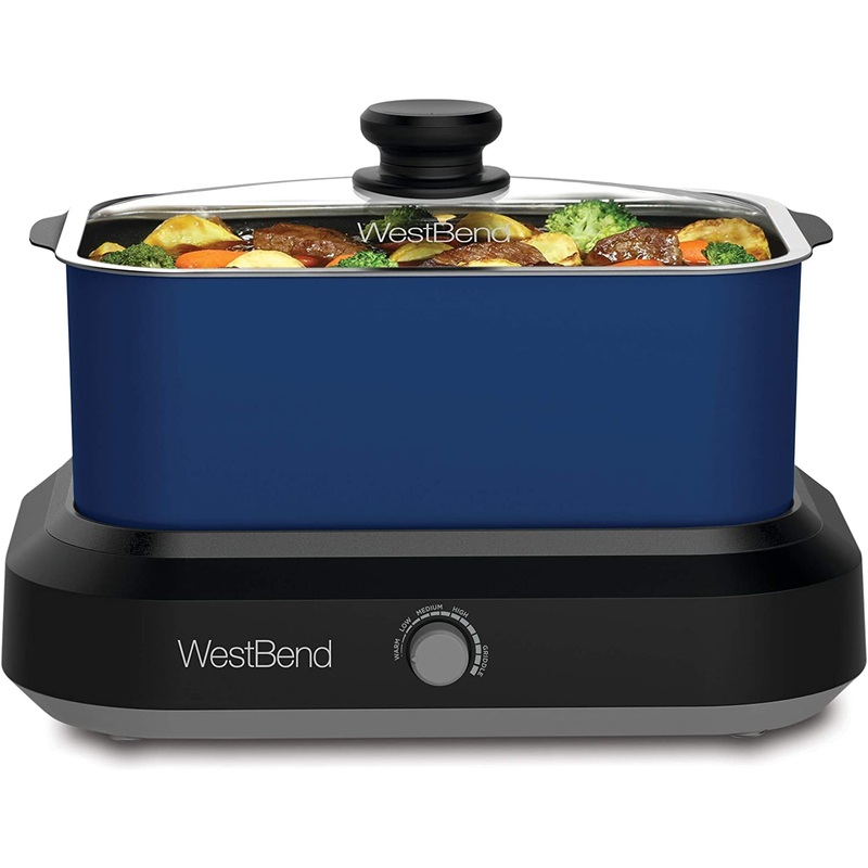 West Bend 87905B Slow Cooker Large Capacity Non-stick Variable Temperature Control Includes Travel Lid and Thermal Carrying Case, 5-Quart, Blue