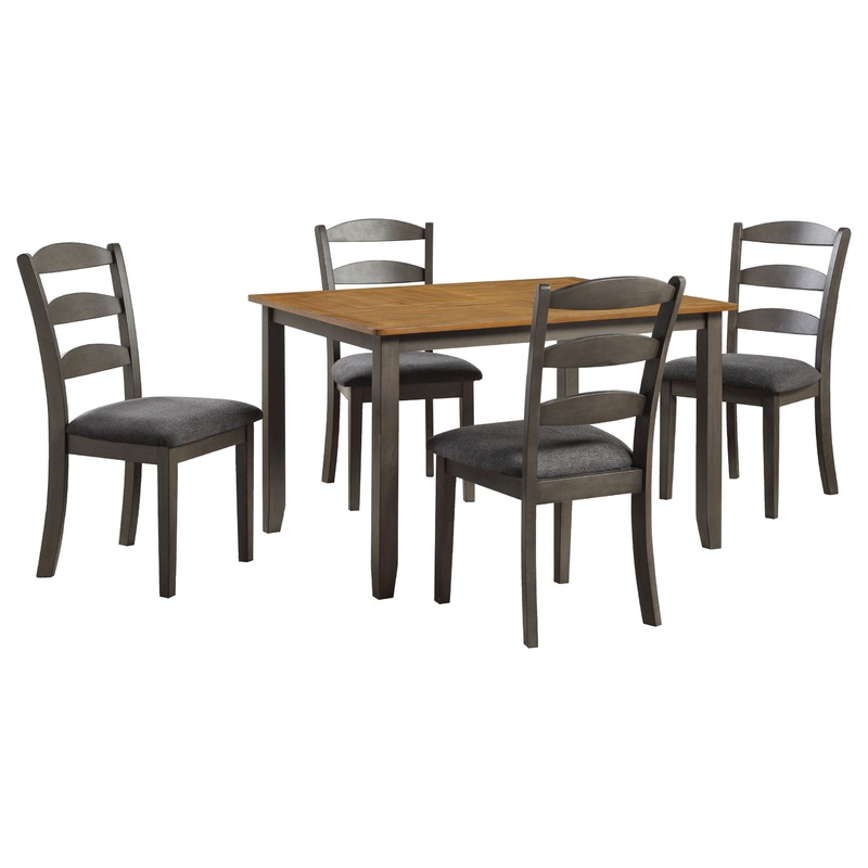 Create the perfect place for gathering, with our traditional 5-piece dining set. Attractive two-tone style provides a beautiful classic farmhouse feel, thanks to a natural woodgrain veneer top and lightly distressed painted frame. Durable rubberwood solid