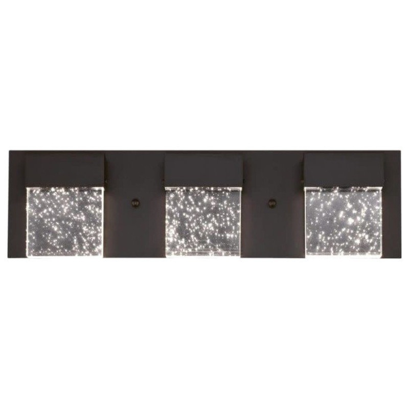 Features Mounting hardware included Constructed from metal Comes with a bubble glass shade Integrated LED lighting Dimmable with compatible dimmers Mountable in different orientations ETL rated for damp locations Covered under a 5 year limited manufacturer warranty Dimensions Height: 5-1/2″ Width: 19-11/16″ Extension: 2-7/8″ Product Weight: 8.98 lbs Shade Height: 4-3/16″ Shade Width: 4-3/16″ Shade Depth: 2-7/8″ Backplate Height: 5-1/2″ Backplate Width: 19-11/16″ Backplate Depth: 1-9/16″ Electrical Specifications Lumens: 1520 Color Temperature: 3000K Color Rendering Index: 80 CRI Wattage: 21 watts Number of Light Sources: 3
