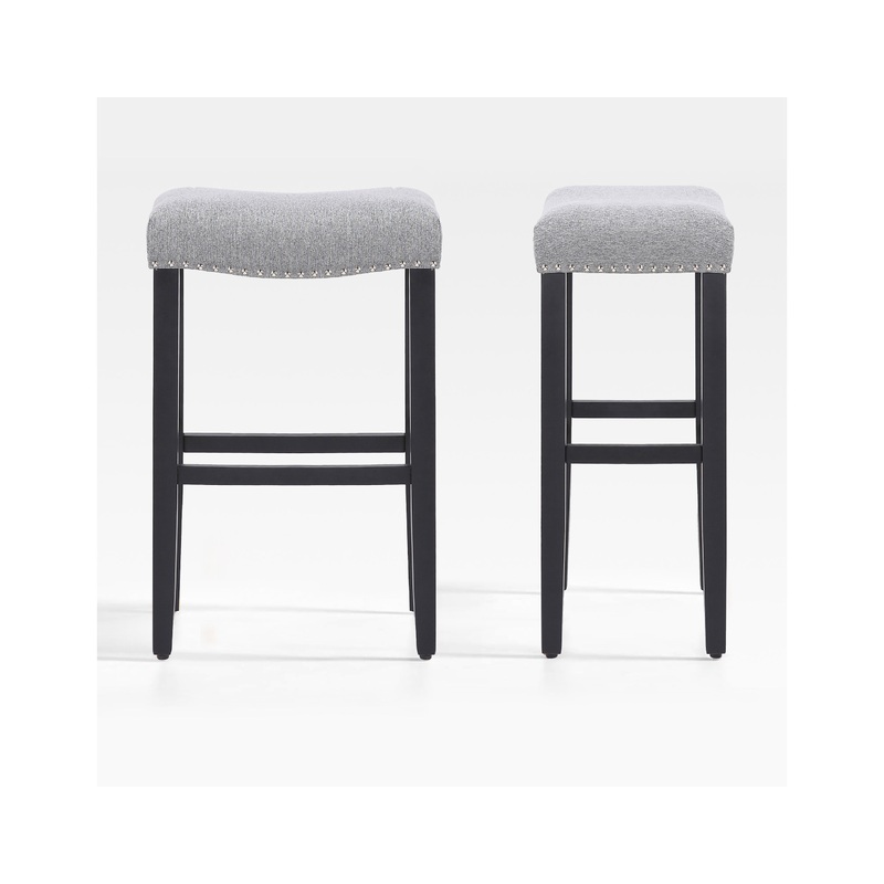 Ideal for any kitchen or indoor bar area, these 29 inch saddle seat bar stools are stylish and comfortable. With well-cushioned saddle style upholstered seats, and crafted from high quality solid rubberwood, this bar stool set boasts an understated craftsmanship that makes them perfect in any area of your home. Designed with comfort in mind, indulge yourself in the bar stool’s high density foam cushioning. Featuring a foam padded linen seat, polished bronze chrome nail head trim, and antique gray stained wood legs with perfectly placed footrest.