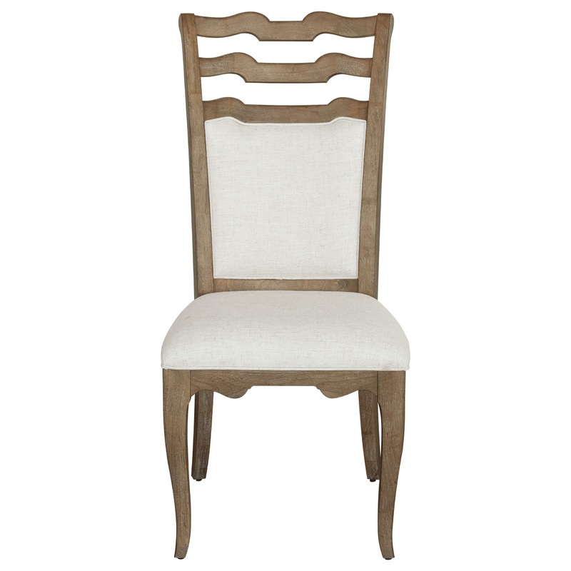 Familiar yet fresh, Weston Hills dining collection combines a casual attitude with traditional French flair. The stylish dining chairs feature open slats at the top of the seat back and a scalloped apron with Cabriole legs. The chair seat and seat back are upholstered in a neutral, linen texture fabric that works with any decor and color scheme in the home. Coordinate with our dining table and sideboard hutch set for the perfect dining space.European traditional design with a casual rustic finishScalloped front and side rails, upholstered seat and back with open slats at the topSeat back and seat upholstered in a neutral, linen look fabricShaped apron with Cabriole legs for added charmConstructed of hardwood solids and cathedral hickory veneersAssembly required to attach the back frame and front legs to the seat; hardware and instructions are included