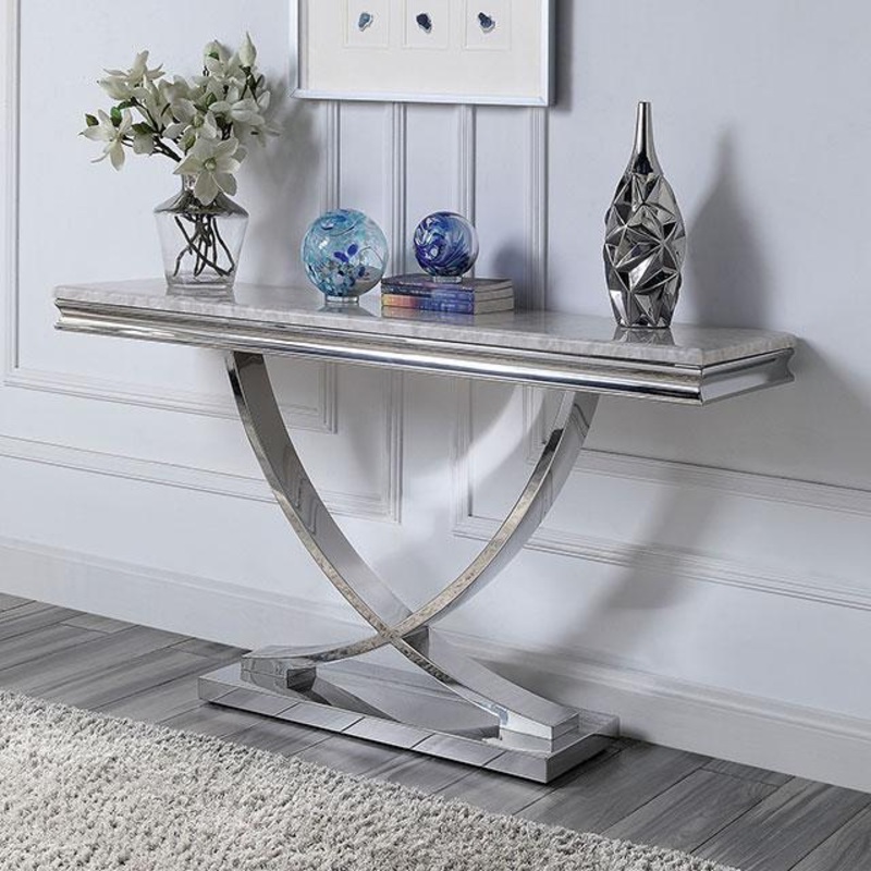 WETTINGEN Sofa Table, 55"L X 16"W X 3"H, 99.8lbs. This sofa table is designed with luxury and exuberance in mind. It features a faux marble top with beveled edges, held up by curved pedestals finished in brilliant chrome. With the interlocking design resti