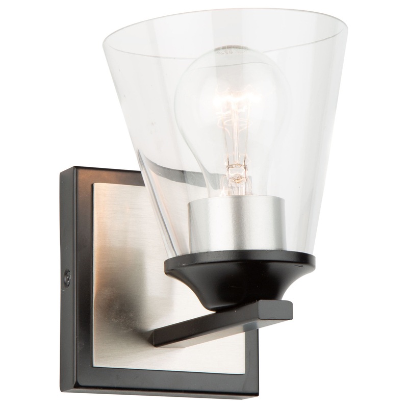 Artcraft Lighting (AC11141NB) Wheaton collection Transitional style 1 light Vanity Light in Black & Brushed Nickel finish. Designed by Lighting Pulse, this “Wheaton” collection bathroom vanity features black frames with brushed nickel accents complimented by clear cone shaped glassware. Light bulb data: 1 E26/Medium (Standard) 60 watt. Bulb included: No. Dimmable: Yes. Rated: Damp location.