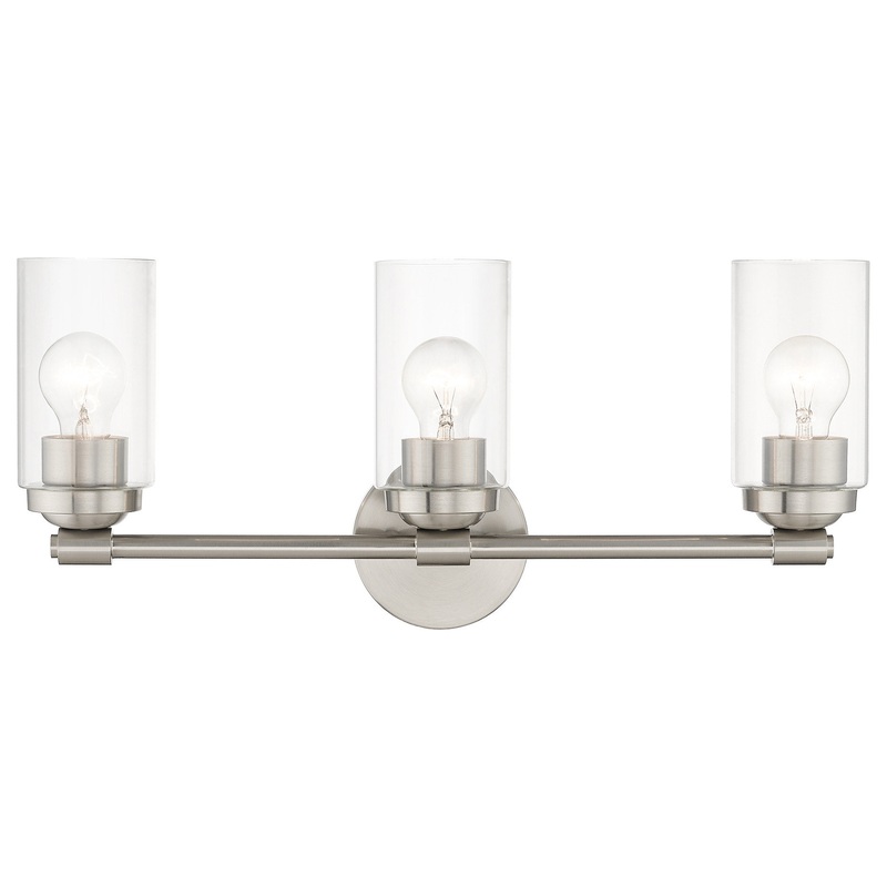Illuminate your home with a bright design from the Whittier collection. This three-light vanity sconce features a brushed nickel finish with clear glass. Perfect for a contemporary or transitional luxury bathroom setting. -Number of Bulbs: 3 -Type of Bulbs