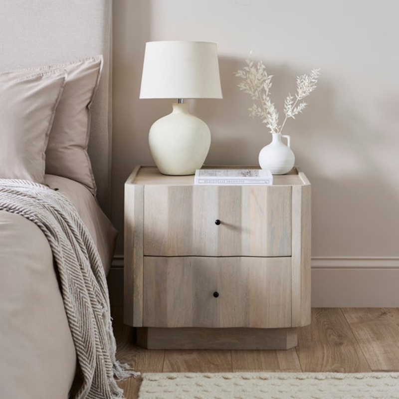Dunelm Exclusive - Designed and Developed by DunelmMade from Mango Wood; Dense material with a warm, golden-brown shade and interlocking grain pattern.3D DesignModern styleElevate your bedroom with this elegant 2-drawer bedside table. Combining timeless st